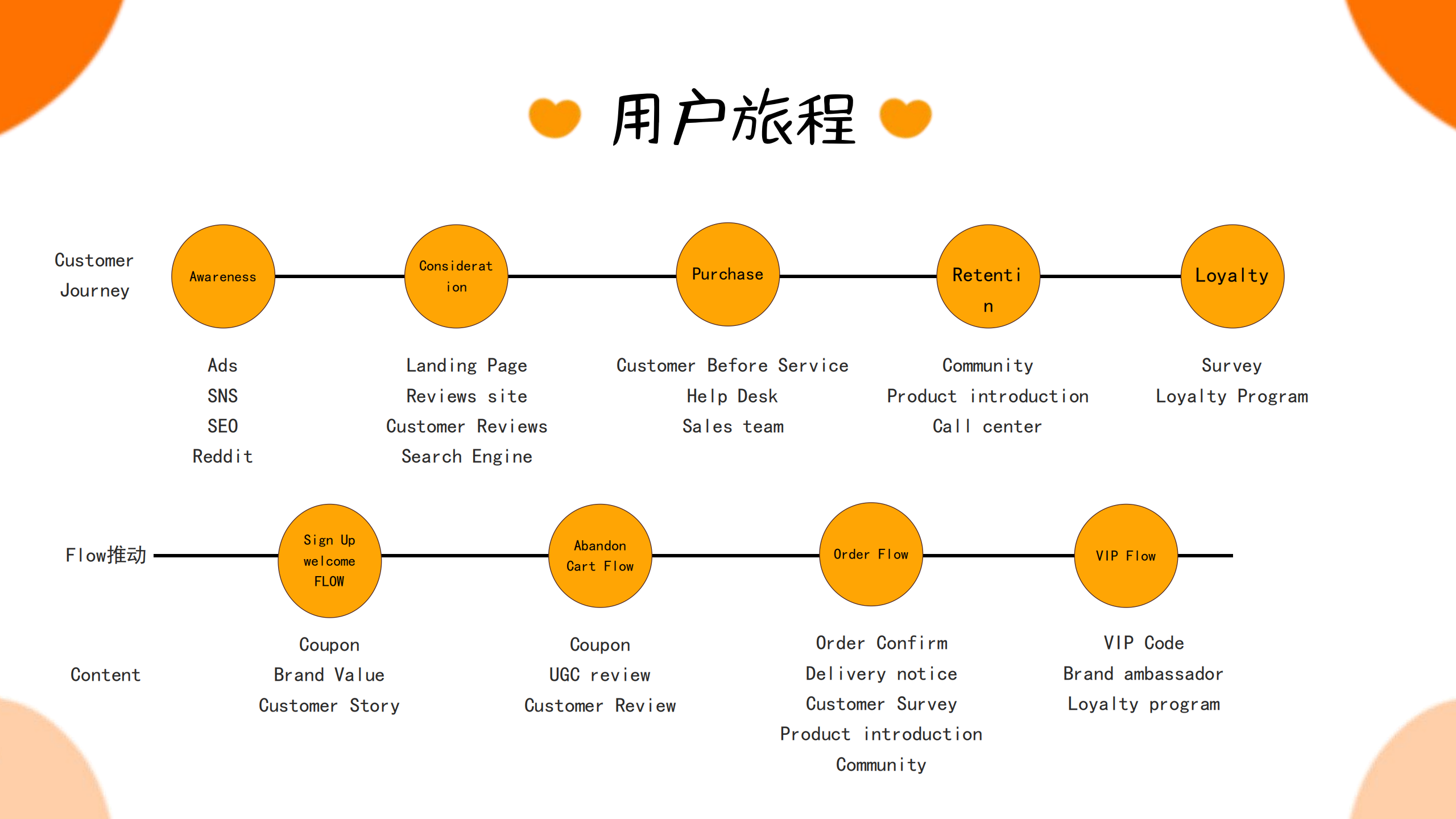 下单以后这个时间,到用户拿到产品的时候,一般我们品牌方容易忽略的问题,这将近2周的时间中,用户非常焦虑,他是下单了,但是这个产品怎么样?发货的吗,咱们是不是骗子网站,用户会有很多问题,这个时候如果能够植入Order Confirm、Delivery notice、Customer Survey、Product introduction、Community以及产品的介绍、用户的社群,让这些用户打消其心中的疑虑,这个时候再到产品,对我们产品非常了解,对我们品牌也是非常熟悉,会记住我们,这个时候才很容易进入到Loyalty这个阶段,如果这个Order Flow大家有没有注意,这两周阶段,我们很容易抓住用户,让用户拿到产品的时候更容易分享。Loyalty这里还可以植入VIP Flow,去筛选一些愿意和我们分享、愿意和我们互动,以及客单价比较多、复购比较多的用户,我们邀请他作为我们的品牌大使以及让他注册一些Loyalty program的积分制度,给他们一些VIP的Code。