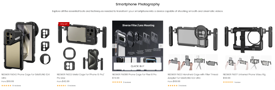 在官网设计上,Neewer 主打一个简洁大方,和谐的色彩搭配突出了品牌的视觉形象,增加了品牌形象的辨识度。从消费者的角度出发,Neewer 独立站里并没有过多的元素和信息堆砌,清晰的产品分类,一目了然的产品规格参数等细节介绍,贴心便捷的筛选和浏览设置,以及用户评价和商品搭配信息的展示,都为用户提供了良好的购物体验,给人带来一种专业可靠的品牌形象。