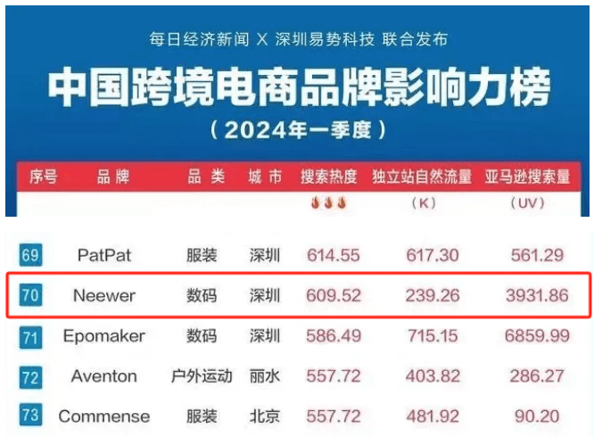 在今年最新发布的《中国跨境电商品牌影响力百强榜》(2024年1月-2月)中,不少摄影摄像配件冲上了榜单,其中, Neewer 凭借搜索热度、独立站自然流量、亚马逊搜索量这三个维度的品牌综合影响力位列榜单第 70 位,向大家证明了小众品类也能有弯道超车的机会。