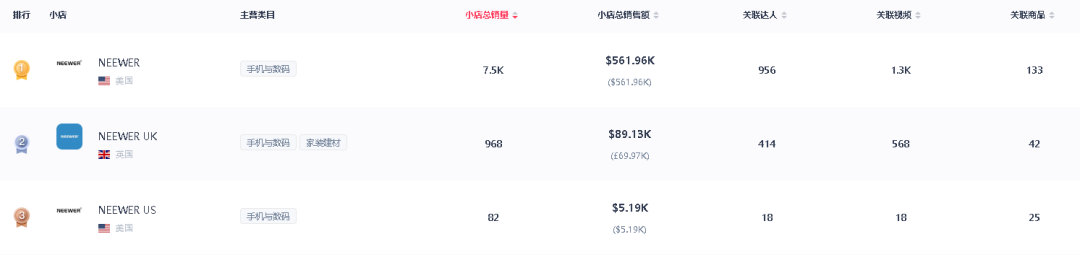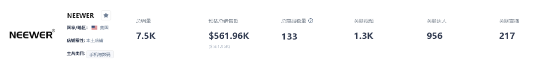 根据超店有数平台提供的数据显示,截止到 5 月 26 日,Neewer 的美区小店总共上架过 133 件商品(包含目前已下架商品),关联达人 956 位,历史总销量为 7500 件,历史总销售额约为 56.19 万,与美国小店相比,英国小店的销售表现则稍稍逊色些,总销量至今还未达到上千,这可能也与当前 TikTok Shop 英国小店整体转化率不太高有一定的关系。