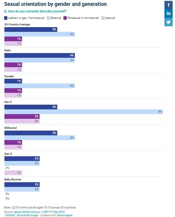 调查的30个国家中,平均有9%的成年人认为自己是LGBTQ。并且,LGBTQ在年轻群体中的占比趋势正在逐渐扩大。其中,Z时代(1997-2012年)大约是千禧一代(1965-1980年)的2倍、是X时代(1946-1964年)的4倍。