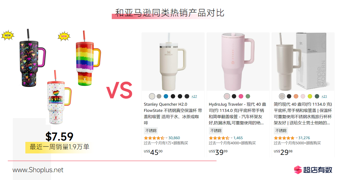在搜索中发现,该类型的产品其实已经在亚马逊上热销过一段时间了,目前需求量依然保持稳定。对比可以看到,Meoky的这款水杯不仅在价格上拉到极致,低于亚马逊价格的3-6倍。同时在外观设计上更加丰富且具备时尚感。为了赢得LGBTQ人群好感,在外观上增加了“彩虹”、“爱心”和”Pride“元素,使其更具吸引力。