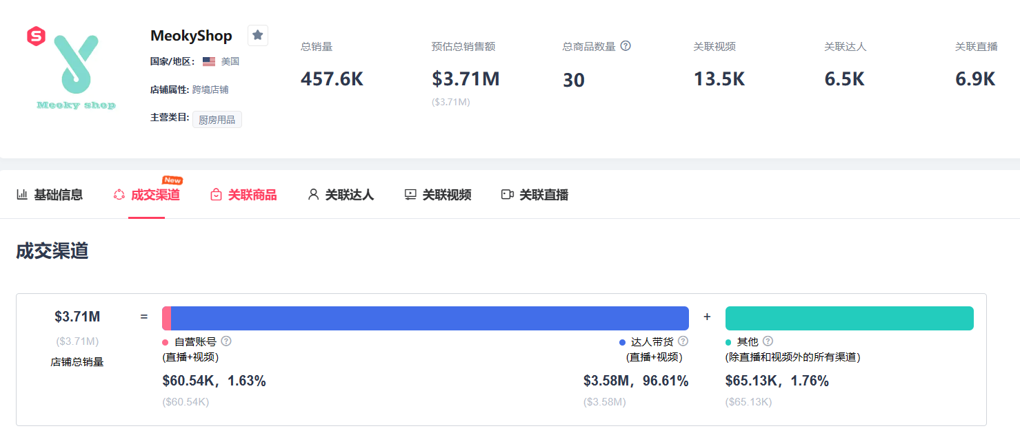 据超店有数数据显示,Meoky目前商品成交主要依靠联盟达人带货模式(直播+视频),直接成交销售占比高达96.61%,其次是自营账号成交。而来自商城、达人主页橱窗等其他渠道占比最低,仅占1.76%。