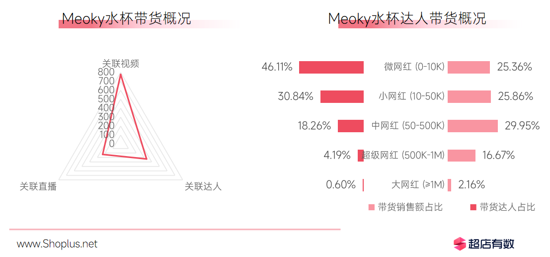 从带货达人概况来看,Meoky主要建联中尾部达人。其中,占比最高的是粉丝数在0-10K的微网红,达到46.11%。从产出效果来看,粉丝数在50K-500K的产出的销量占比最高,达到29.95%。