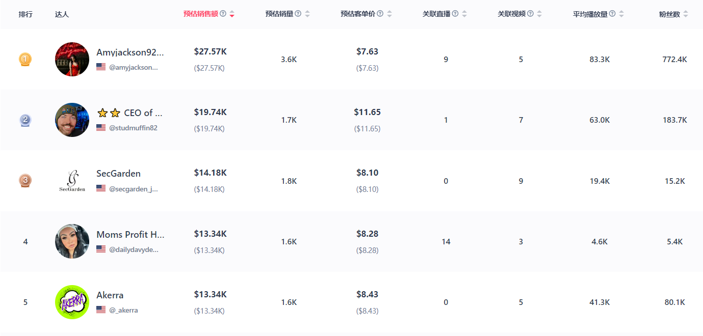 在带货达人排行上,前5名达人带货销售额均在1.3万美元以上。其中,@amyjackson9213预估产生的销售额最高,约2.7万美元。该达人主要做生活和带货相关内容,目前粉丝数累计77.2万人。