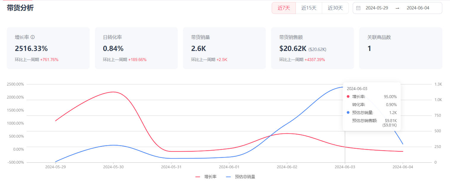 再回到产品上,该款产品是由Meoky推出的大容量水杯,最早于今年的4月27日上架,而到了最近一周,也就是进入6月,销量才以来暴涨。近7天累计销量1.9万单,预估销售额达到15.7万美元(约113.6万人民币)。