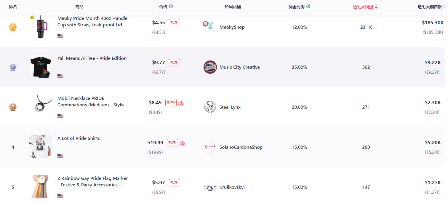 在超店有数中搜索“Pride”,可以发现已经有源源不断的相关产品涌现。目前还处于“骄傲月“初期,卖家仍有爆单机会。