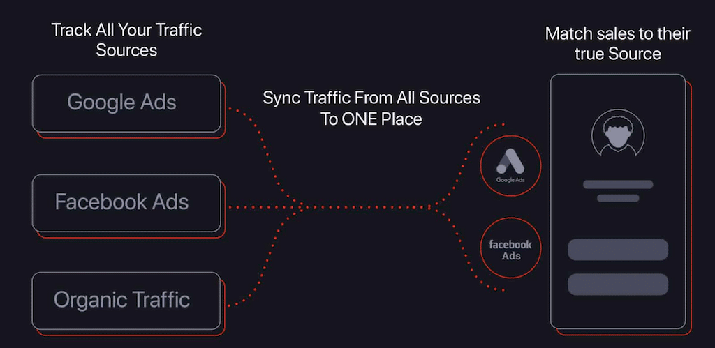 The platform uses installable tracking codes to collect customer data such as IP address, cookie, browser session, and phone number from your marketing funnels, attributes the conversions cross-channels, identifies each customer’s journey, and then feeds data to your ad platforms’ AI to improve targeting.