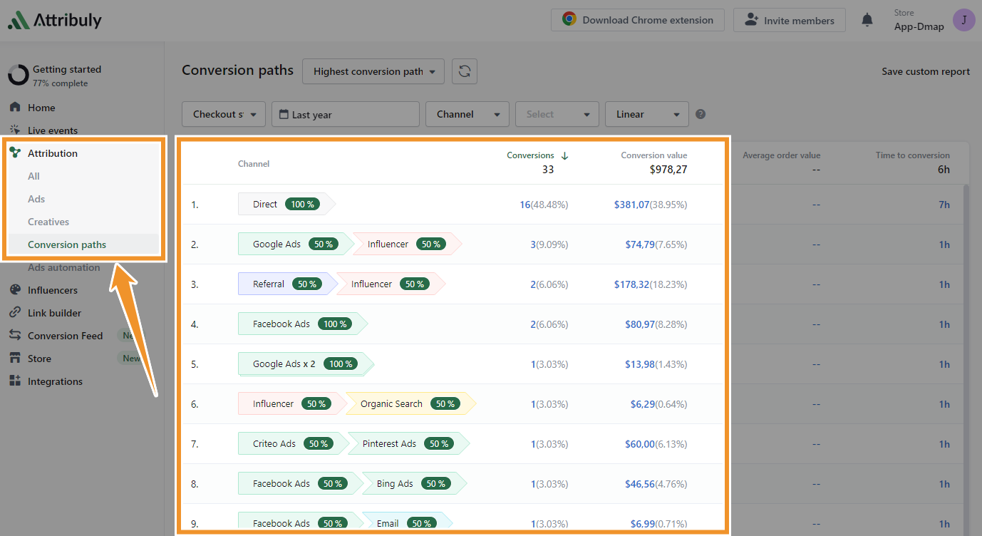 - Conversion Paths — where you can visualize how users find your store and through which channels they travel before converting.