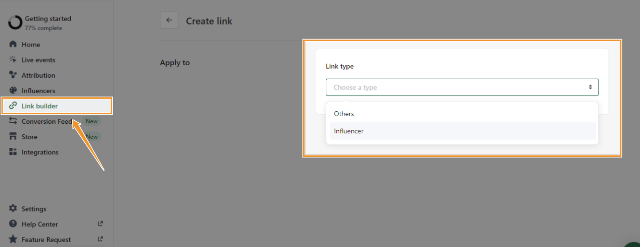 Next to the influencer tab is a Link Builder page that generates short, trackable links you can share across multiple channels or use to track influencers’ activities.
