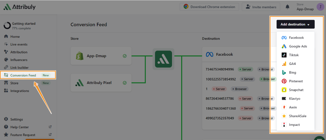 Attribuly also has a Conversion Feed tab, where you can integrate server-side tracking with ad platforms like Facebook, Google, TikTok, and Bing.