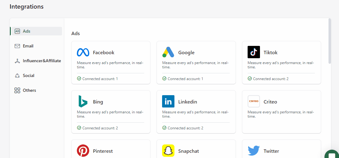 The final toolset on Attribuly’s app is the Integration menu. Here, you will find all the third-party tools like MailChimp, Awin, Twitter, Criteo, and more. Plus, the tools to build API integrations.