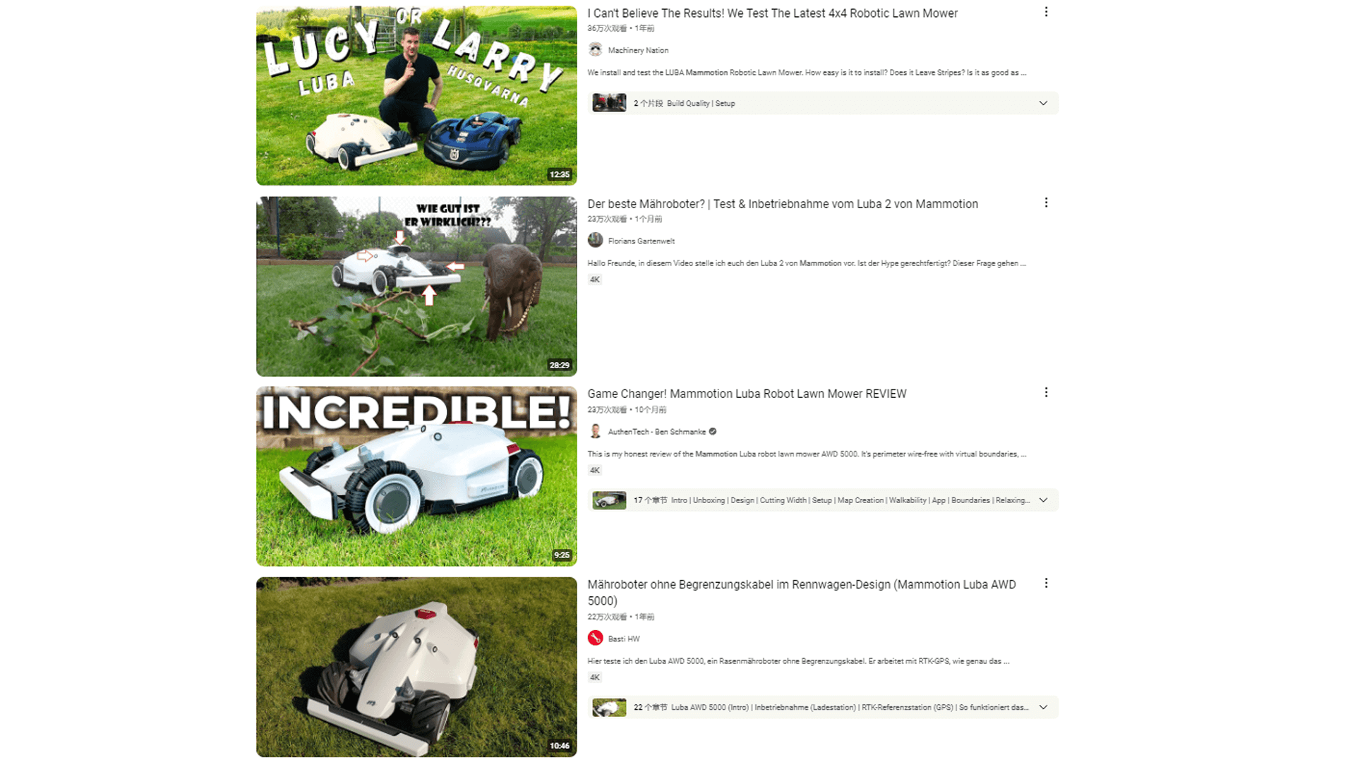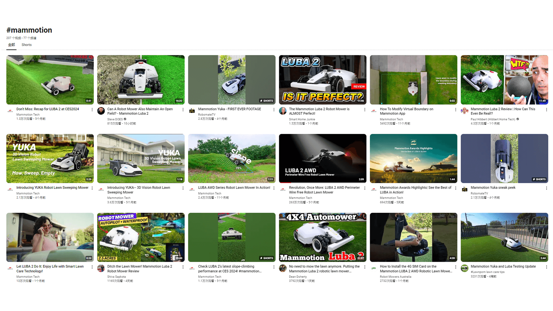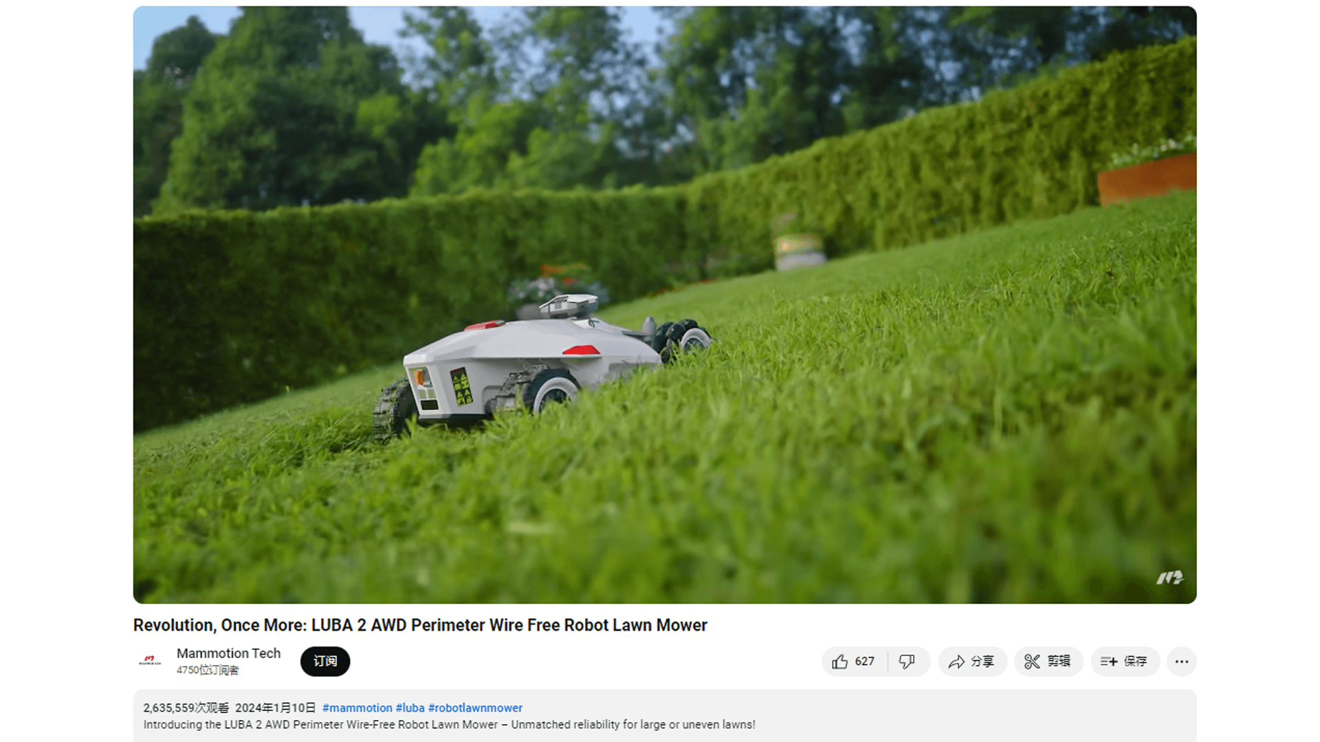 在YouTube上,Mammotion的官方账号收获有4750的订阅,发布内容主要为产品的宣传视频,在五个月前Mammotion在YouTube号发布的一条新产品LUBA 2割草机器人的视频,其播放量截止到现在已经达到263万。证明其除了与网红KOL合作带来视频流量外,产品与品牌本身在YouTube上的声量与知名度。