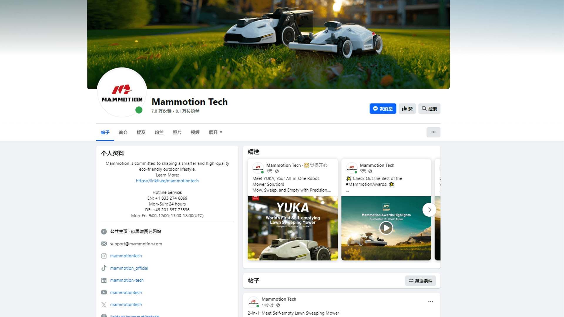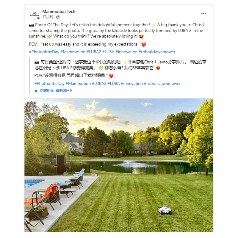 Mammotion在Facebook目前的订阅用户达到8.1万,在Facebook的简介中放置有独立站链接,此举有利于通过社媒向品牌网站引流,Mammotion在Facebook的账号很活跃,主要发布内容为产品展示、营销活动推广等,并且还会发布一些消费者反馈的UGC内容,这样可以拉进与消费者的距离,增加品牌好感。
