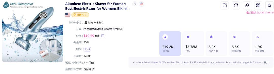 据 EchoTik 提供的数据显示,从 2023 年 12 月上架至今,这款 Akunbem 女士电动剃须刀在 TikTok 上总销量超 20 万件,累计销售额已超过 300 万美元,成为该平台上女士电动剃须刀品类的翘楚,同时占据 TikTok 美区美容个护电器类目排行榜第一位的位置。