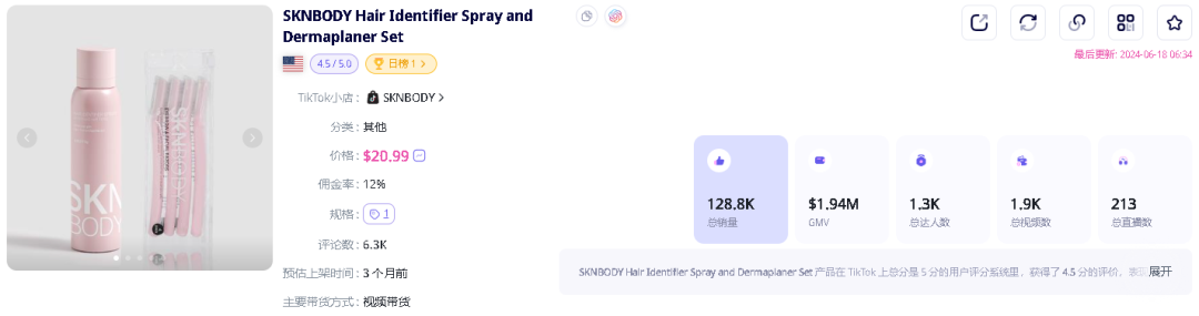 针对市面上女性面部毛发清理这一空白市场,新兴的美妆品牌 SKNBODY 凭借一款专为女性设计的面部剃须刀和毛发识别喷雾组合套装在 TikTok 美区成功走红,上架小店 3 个多月至今,总共售出了 12.88 万件商品,总销售额达到了 194 万美金。
