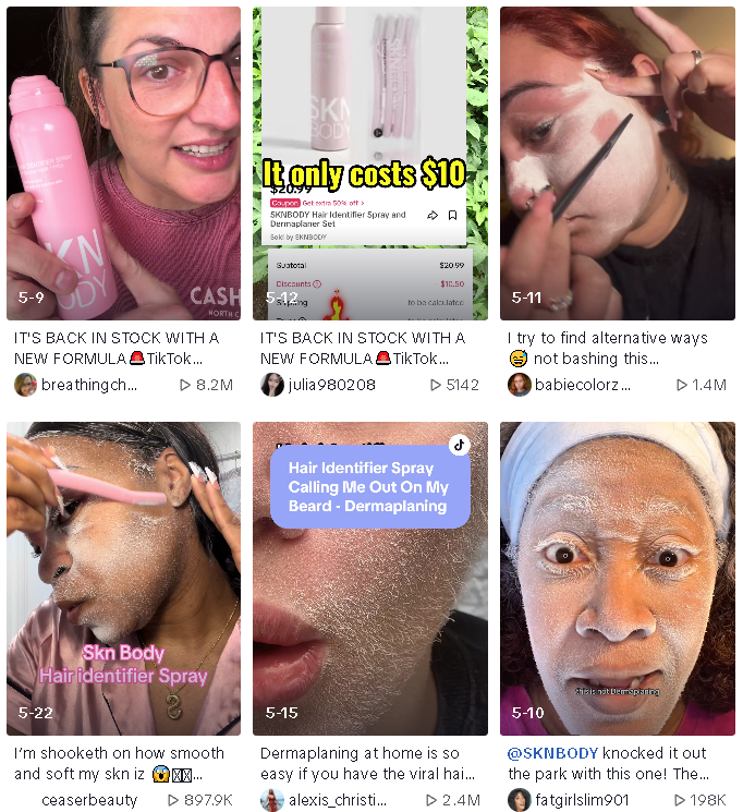 自商品上架以来,SKNBODY 先后建联了上千位达人,在 TikTok 上,达人们直接用 SKNBODY 的产品来去除脸上的毛发,新奇特的“面部毛发识别喷雾”直接上脸,以及使用前后的对比效果图,给用户带来了极强的视觉冲击力,在观看视频的过程中刺激着他们的购买欲。达人大规模的推广也使得 SKNBODY 迅速成为 TikTok 上的爆款产品。