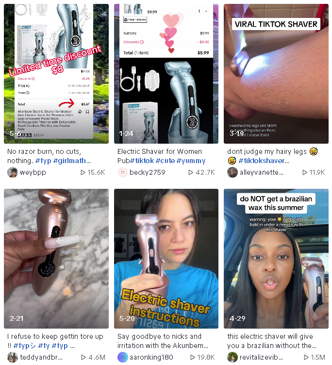 除了从产品本身出发为女性提供高品质的剃须解决方案,Akunbem 品牌还非常注重 TikTok 等社交媒体平台的营销,通过灵活运用社交媒体平台,进行持续的内容输出、达人营销和精准的广告投放,产品带来了巨大的市场曝光,成功吸引了大批目标用户。