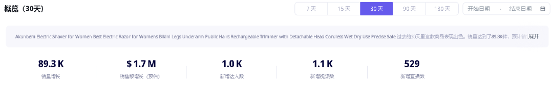 此外,社交媒体平台的流行以及网红的推广也为这些产品提供了全新的营销渠道和传播方式,让品牌触达消费者的成本大幅降低。在这样的大背景下,Akunbem 女士电动剃须刀凭借优秀的产品性能和出色的社交媒体营销,在 TikTok 美区实现了高速增长,销售数据令人瞩目。
