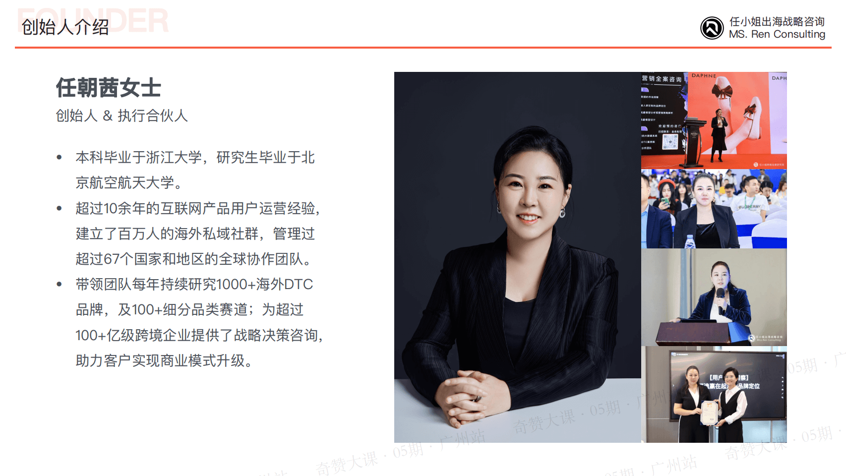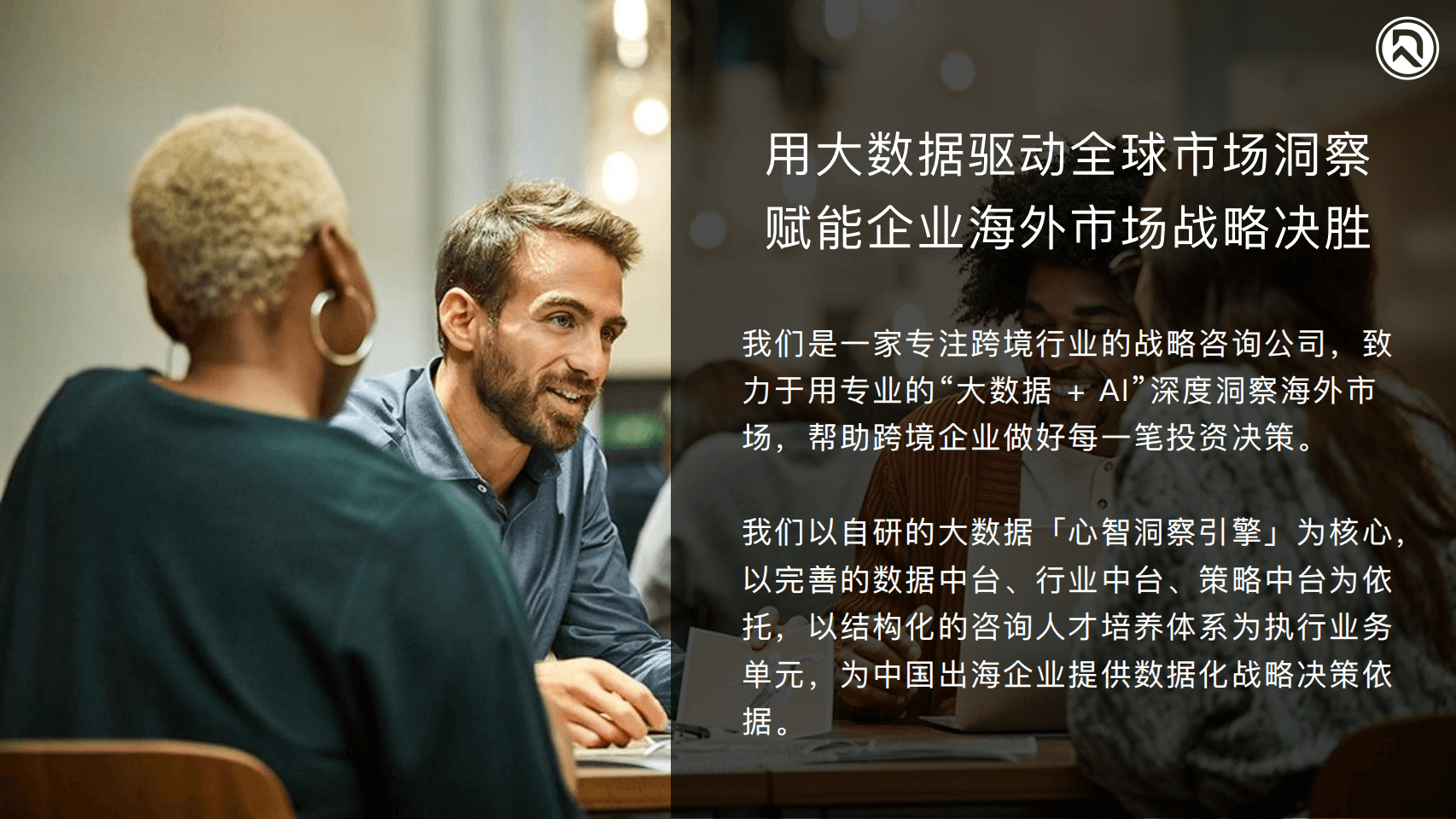 我介绍一下我们的公司背景。任小姐战略出海咨询是第一家专注于跨境出海行业的战略咨询公司,我们是用大数据的方式帮助客户做深度全面的市场洞察,基于此,我们在上面做商业规划和研判,所以我们的特色之一就是我们有强大的数据中台,帮助我们的客户能完全、完整地了解海外市场。