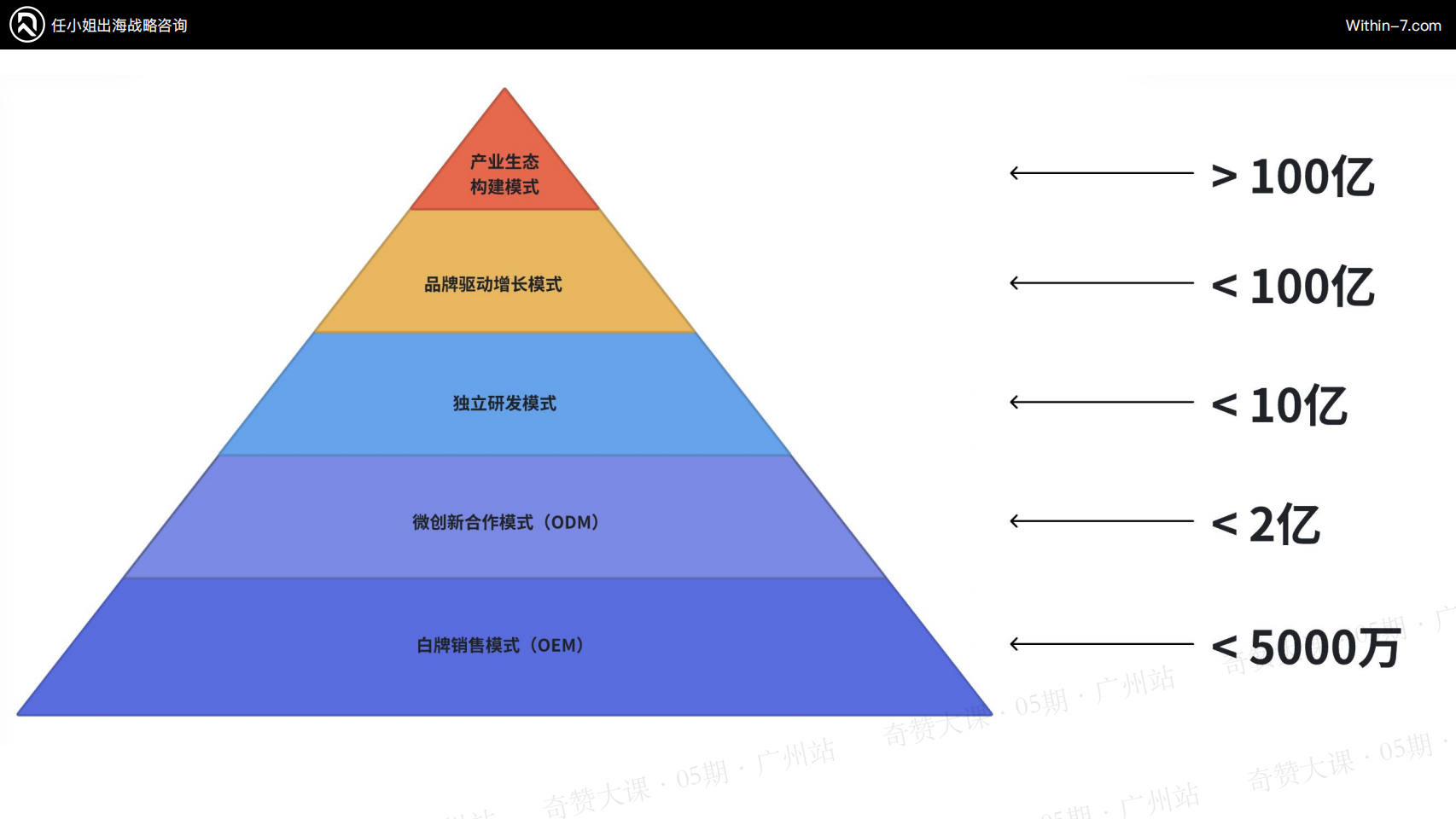 再往上是微创新,比如我们拿白牌耳机卖了很久以后,我看到亚马逊上有差评,比如耳机过重,想轻一点,我就想做改进,变成私模,就是微创新的模式ODM,这个天花板比白牌高一点,在2个亿左右。