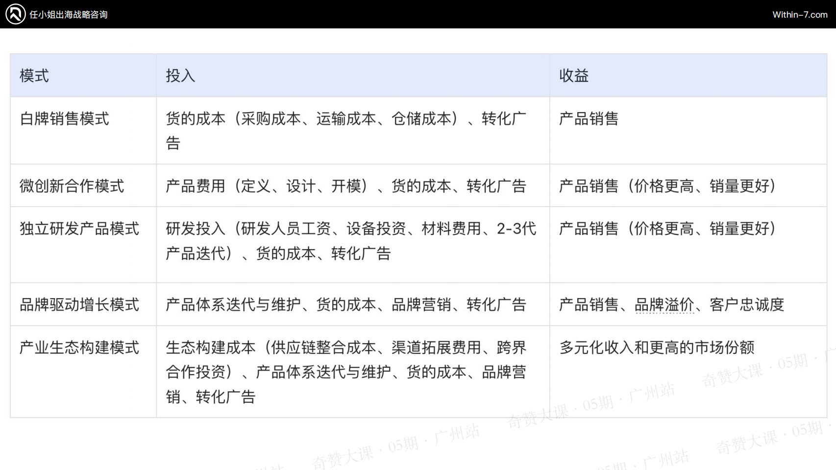 前三个我们看到白牌、微创新、独立研发产品模式算账都是很简单的,货的成本、转化广告的成本,收益就是产品销售额。就是我把货采购过来了,发过去了,加上广告投放费用就是我所有成本了,我卖出多少钱,减去多少钱就是我的利润。大家为什么驱动做微创新?就是因为我的品牌的确没有什么竞争和差异化,所以我要做微创新。但你看它的投入还是比较简单的,还是产品的费用,比刚才多了一点,包括了产品的定义、设计和开模费用。还有获得成本和广告转化成本。它的收益还是比较简单,还是产品的收益,但收益比较高,有差异化,不是你的品牌溢价,只是来自你产品是私模差异化带来的,所以你的产品定义是产生了收益的。