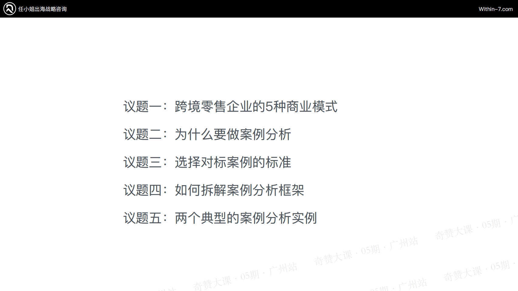 我们来看一下,今天有五个议题,一是跨境零售企业的五种商业模式,我们要讲一下品牌的意义;二是为什么要做案例分析;三是如何选择对标案例标准,刚才李总也说,我们最重要的是讲如何拆解案例分析框架,为什么我放在后面呢?因为我们自己做内部培训的时候,非常重要的一点就是要知道这个事情的意义和价值,你不知道的时候,我们告诉你做ABCD,然后你去做,效果是极差的,你也不知道重点要放在哪,甚至都不知道做出来有什么意义。我会花一点时间讲为什么要做案例分析,我觉得今天会给大家不一样的思路,为什么对标案例拆解、对标案例分析、商业模式导出在所有战略咨询公司会占到80%以上的工作,这是非常重要的。对我们将来自己的思路,在不同层级中,包括老板、营销、产品包括最重要的品牌都会有很重要的指导意义。