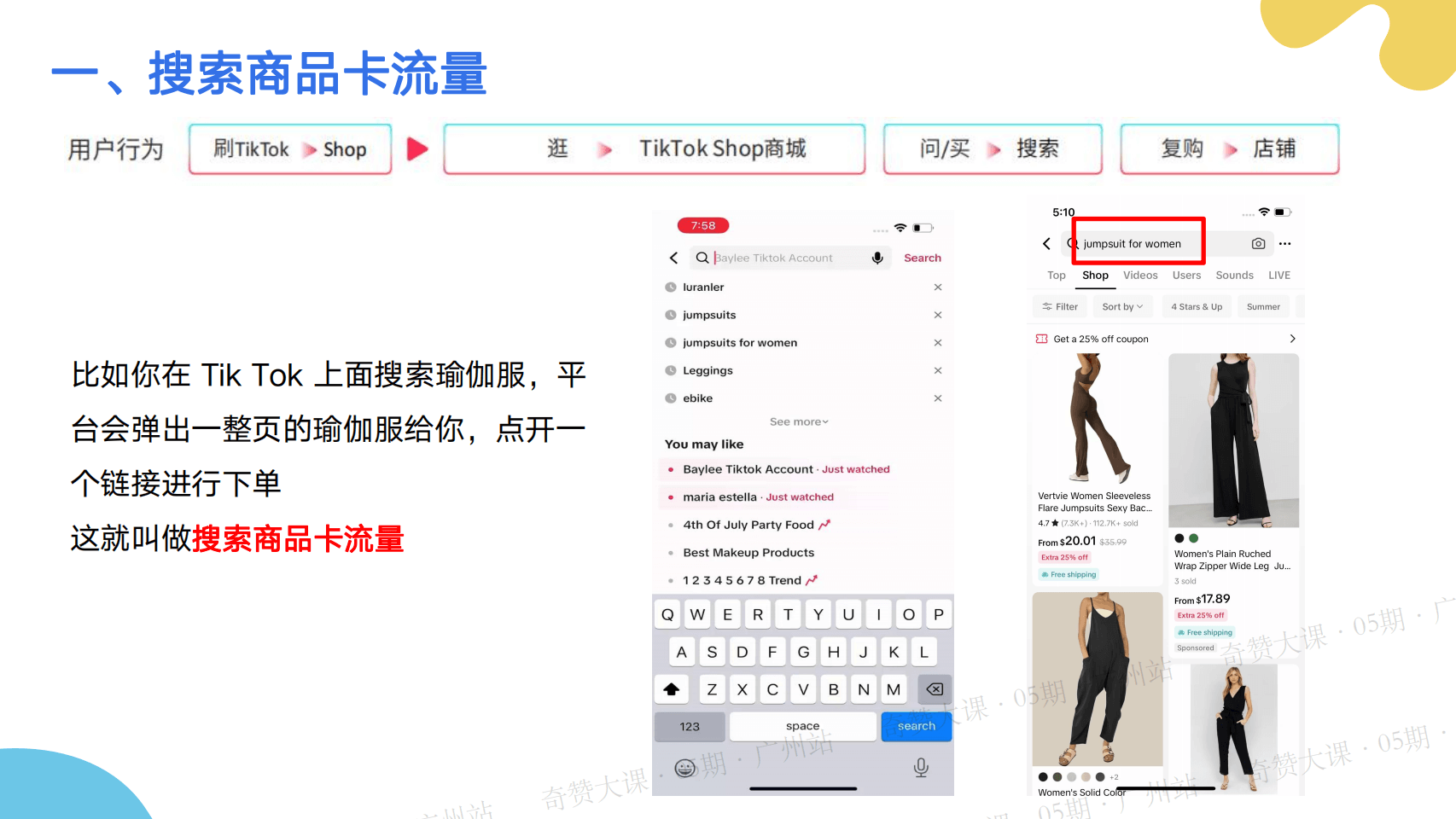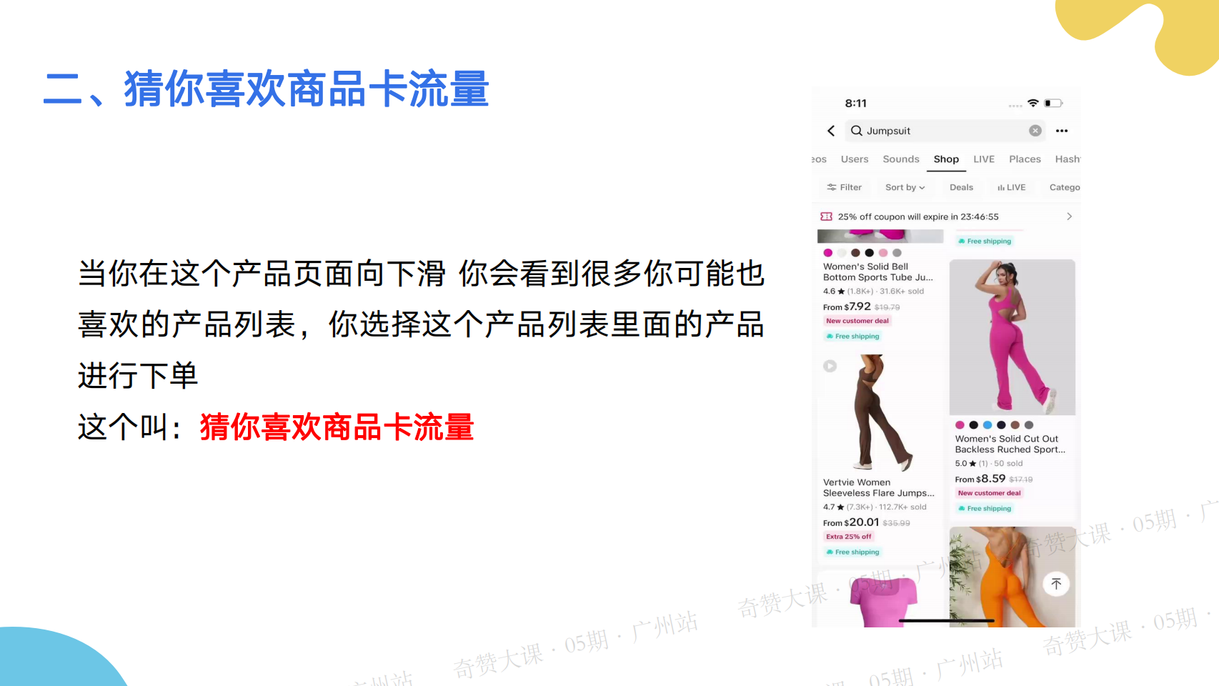 第一个是搜索商品卡流量,如果你做过TikTok,是像国内抖音逻辑一样的道理,比如在TikTok搜索瑜伽服,平台会弹出一系列的瑜伽服给你,你点开一个链接,这就叫搜索商品卡。你搜索连体衣,有一系列连体衣弹出。