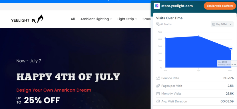 直接访问流量的高比例证明Yeelight已经建立较高的品牌知名度,已经拥有一定比例的回头客或忠实用户,他们对品牌有信任感并愿意重复访问。