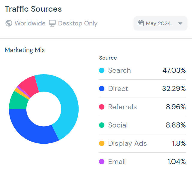 其次,外链的流量占比为8.96%,社交流量占比8.88%以及少量的展示广告和邮件营销。