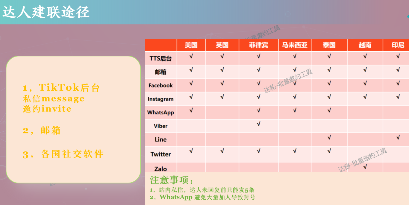 邮件和社交媒体联系:利用WhatsApp、Line等海外用户常用的社交平台与达人联系,建议注册海外手机号用于这些账号。