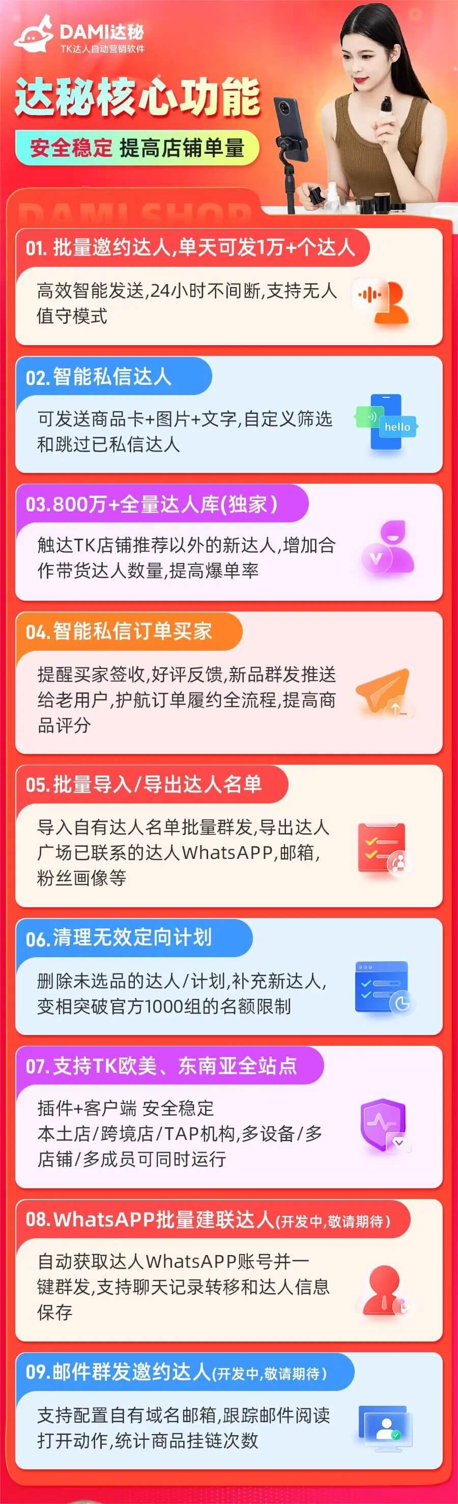- 批量邀约:自动化批量邀约达人的功能,大幅提升了运营效率。一天可以轻松邀约上万个达人。