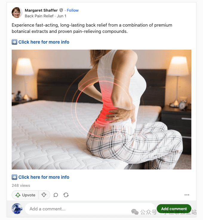 账户的装修做的很简单,直接姓名加一张人物照片,不过这些信息大概率都是用 AI 生成的。且在账户的描述区里,加上了“Back Pain Relief(缓解背部疼痛)”这样的字眼,说明这个账户的主要内容方向便在于此。