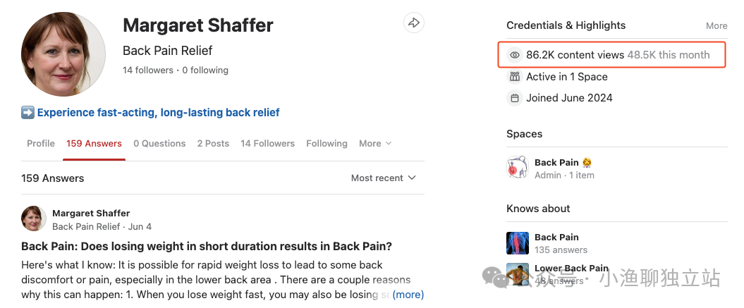 具体的 Profile 信息见下面的截图,可以看到这个账号是上个月注册的,活跃历史并不长。尽管这样,还是在 Quora 上获得了近 9 万次的内容浏览(本月近 5 万次浏览)。