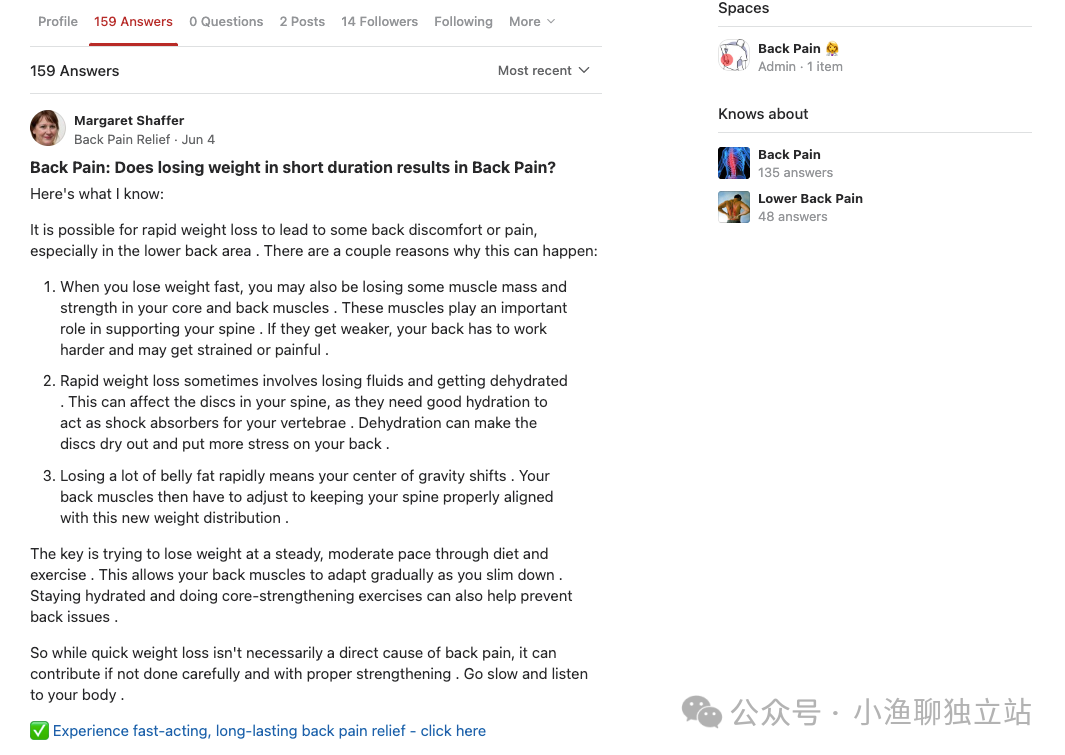 然后便是输出内容,看他们的行文内容,大概率都是 AI 协助生成的,估计改都没改直接上传上去的。至于这些回答的问题从哪里来的,这就很简单了,直接用关键词去匹配搜索。这种方法之前介绍了太多次了,便不再展开了。