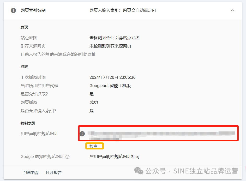 “网页会自动重定向”和“备用网页”这两个导致未被索引的原因我归到了一类中,是因为如果是这两种原因导致的不被索引,你只需要查看是否有声明规范网址,如果谷歌给你的结果是已经有规范网址。并且“检查”已经收录规范网址,那么这里就不需要对网站本身进行修改了。