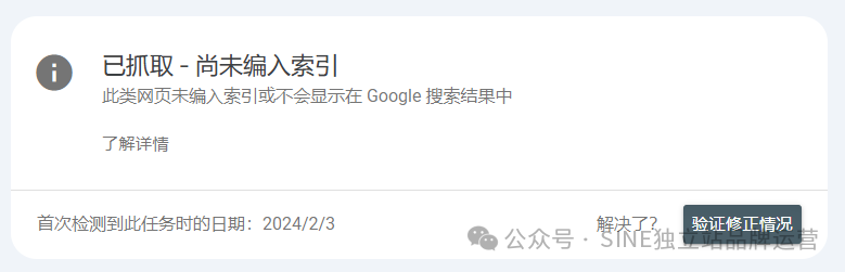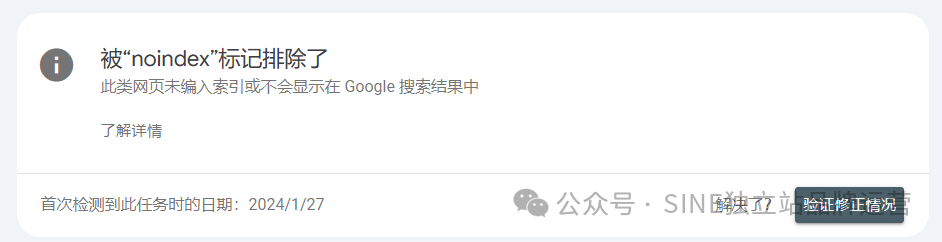 如果你的“网页未被索引的原因”类别里有这个条目,那么谷歌会给你提供一个帮助文档指导你如何操作。如下图,点击“了解详情”可以查看谷歌帮助文档。