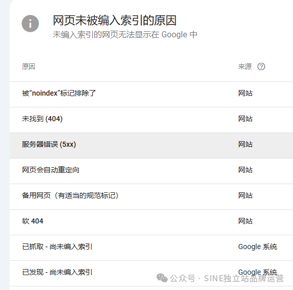 此外,原因列表里的“来源”字段标记了产生问题的来源,作为技术,我们主要需要解决的是“网站”来源导致的noindex问题。