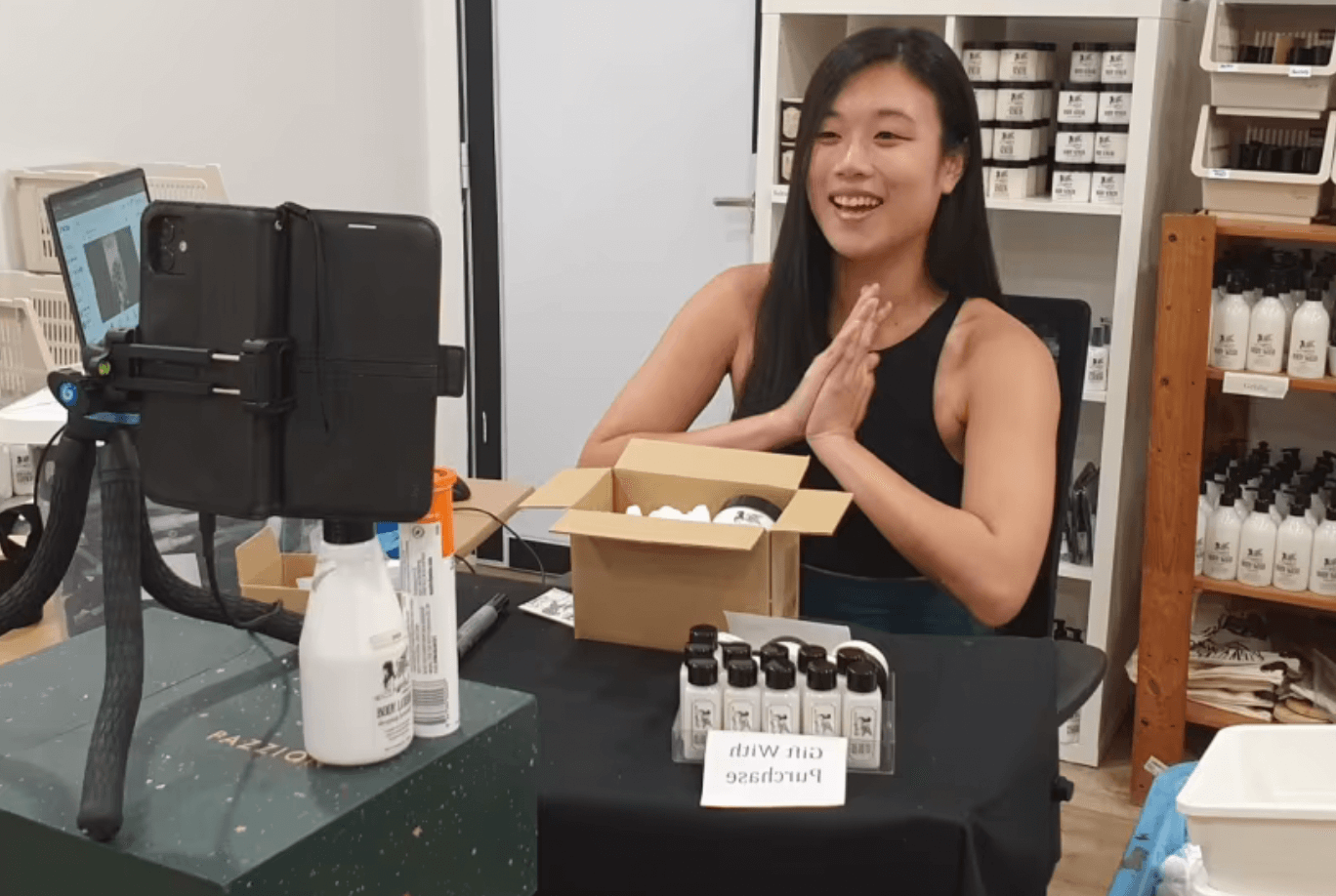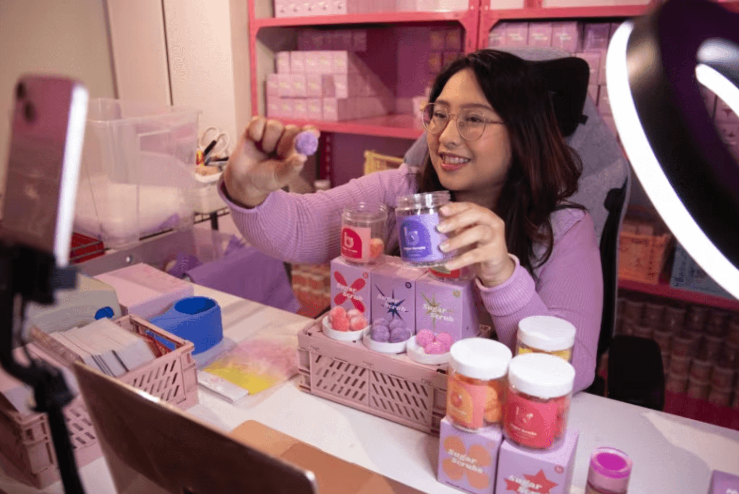 她的每场直播通常长达5个小时,在直播中,她会打包订单,介绍各种身体磨砂膏,并进行产品演示。