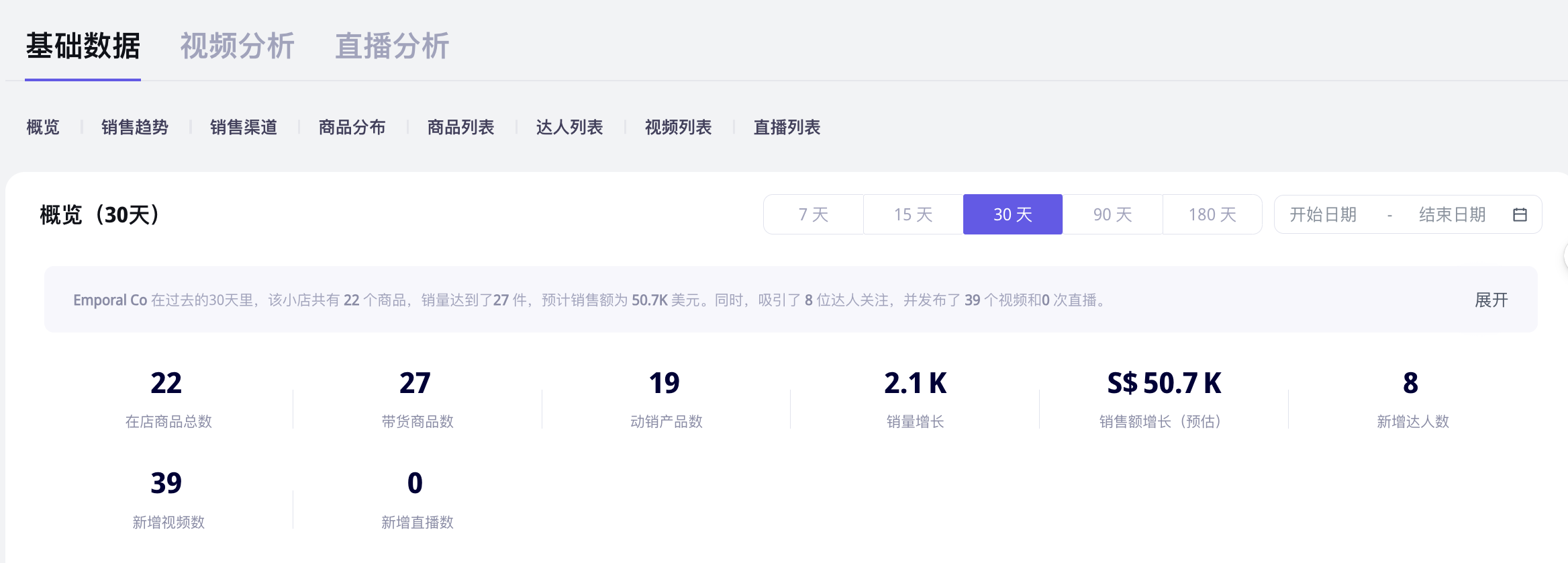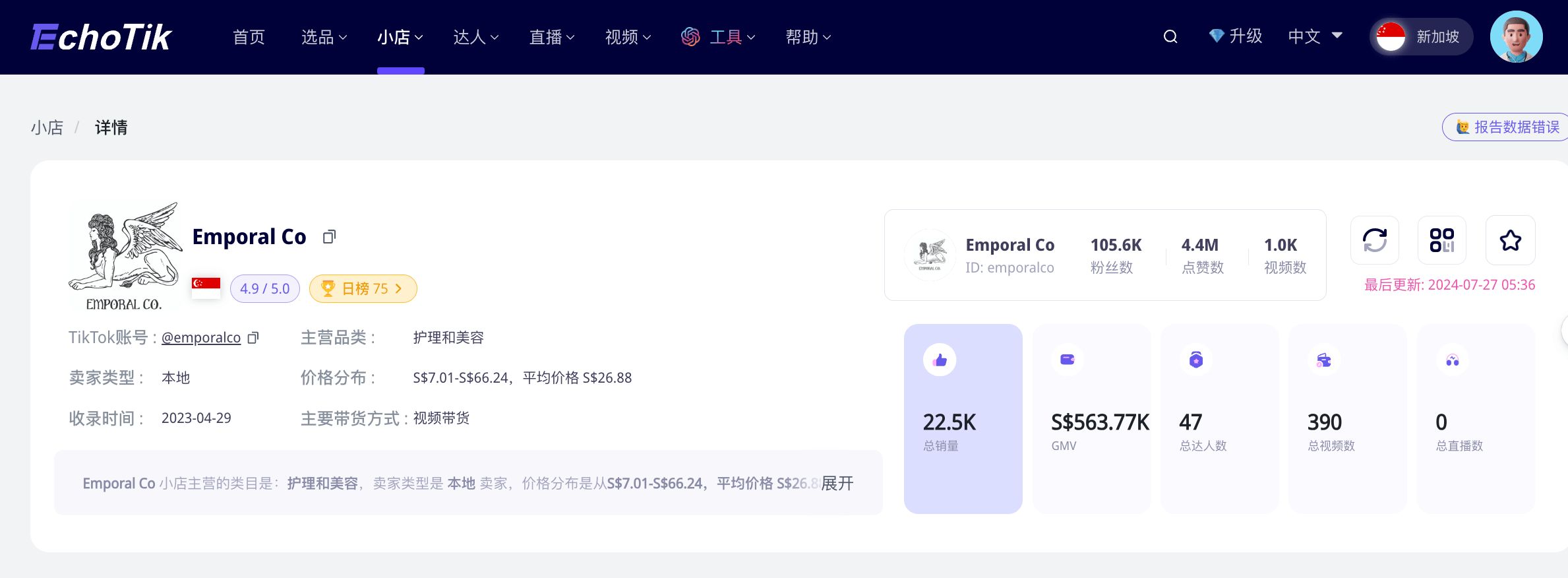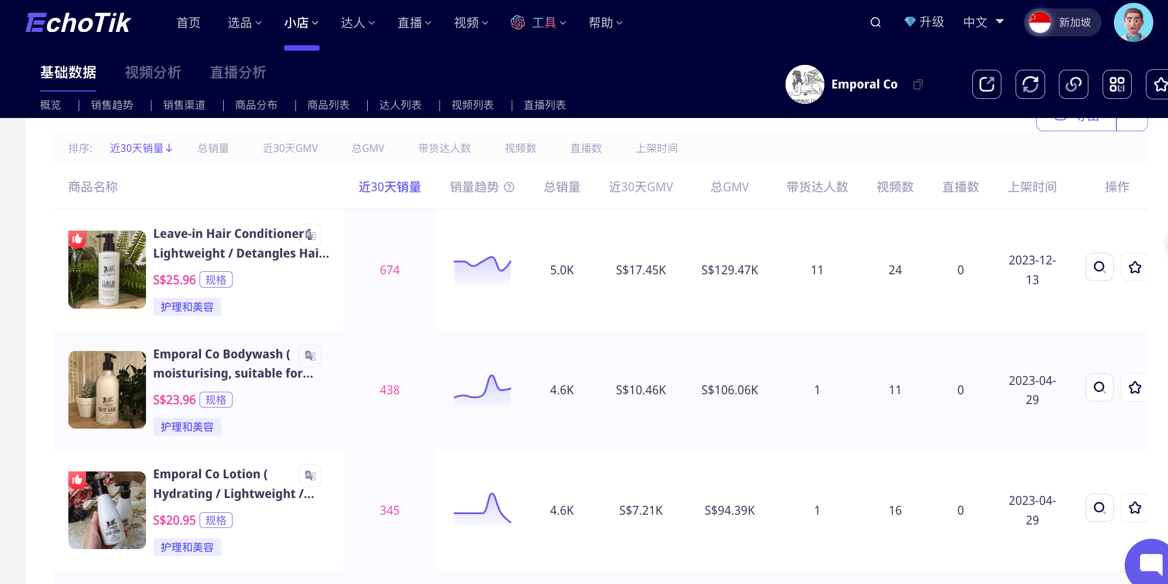 据Echotik数据显示,Emporal Co. 新加坡小店上线于2023年4月,仅一年多的时间,销量已经达到2.2万多件,总GMV达56.4万新加坡元(折合人民币300多万)。