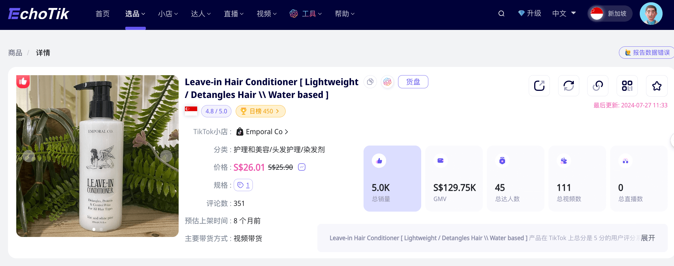 据Echotik后台数据显示,Emporal Co. 近30天销量最高的是一款免洗护发素,这款护发素可以在发型不好的日子里让头发更加顺滑。这款单品总销量达5000多件。
