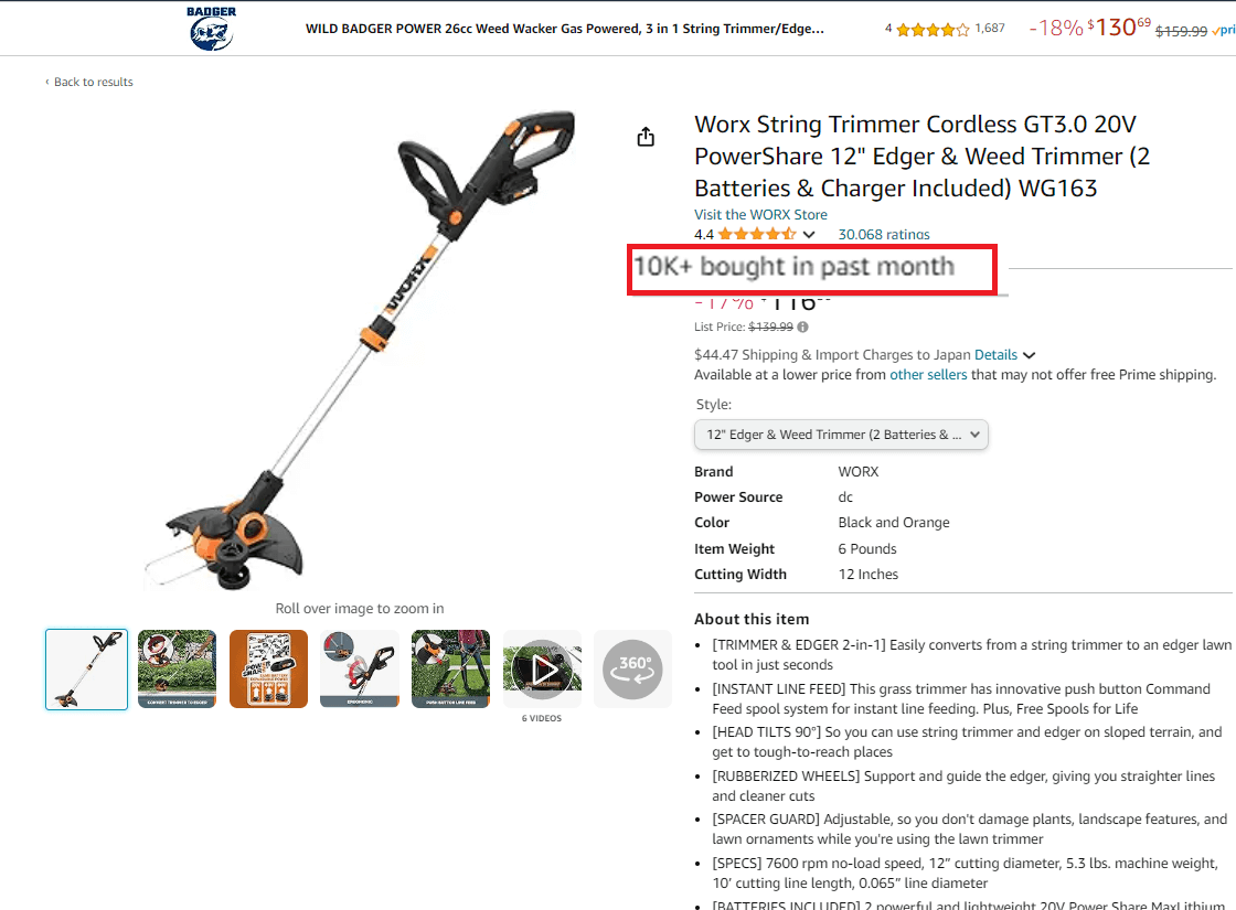 WORX品牌中最畅销的产品莫过于GT3.0无线割草机了,售价116.5美元,月销10000+。