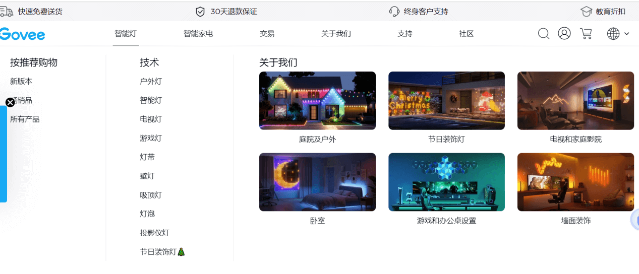 于是,2018年同步开启了独立站的在线运营。观察Govee的独立站发现,它不只是一个商品交易的场所,更是被塑造成一个灵感激发和互动交流的枢纽。