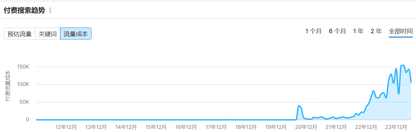 付费搜索的占比为17.09%,根据semrush显示,一到节日govee的推广费用就会增加,目前每月的推广费用在10万美元左右。主要投放的关键词均以品牌词及相关长尾词为主,共投放199个关键词。