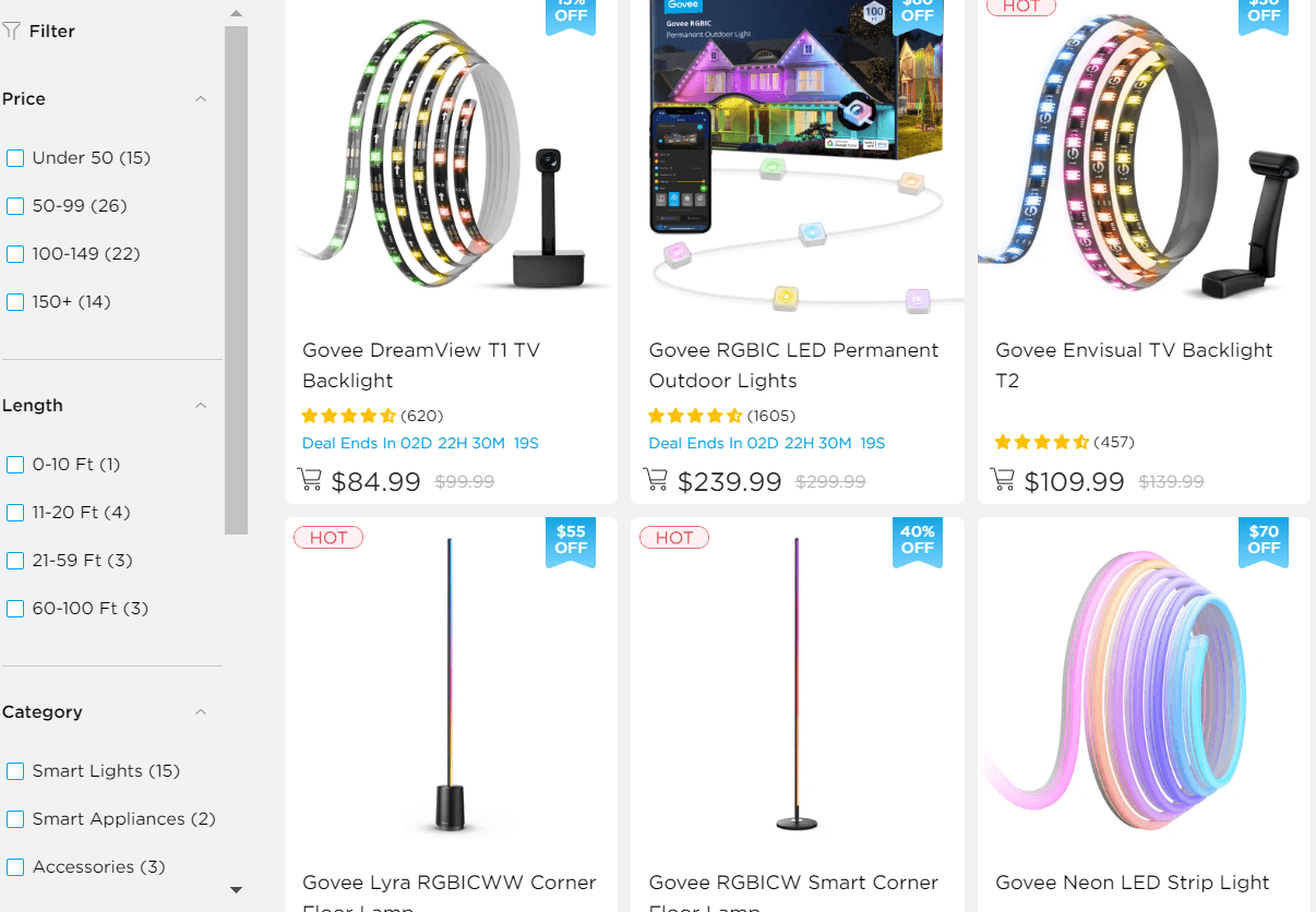 Govee针对美国消费者推出了一系列的灯具产品,包括户外灯、智能灯、电视灯、游戏灯、灯带、壁灯、吸顶灯、节日装饰灯等77件产品,售价在19.99美元-700美元不等。