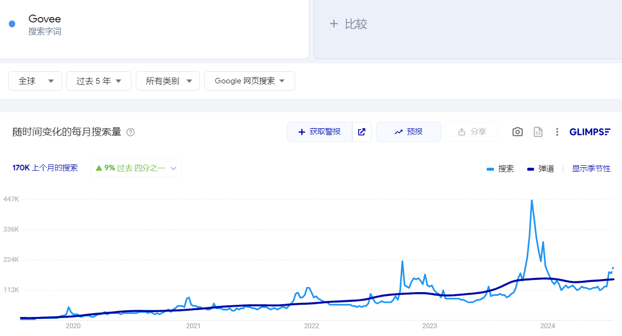 一般来说,装饰照明较受节日影响。每年的11月至12月,随着节日气氛的日益浓厚,Govee的搜索量和市场需求也会迎来显著的高峰。