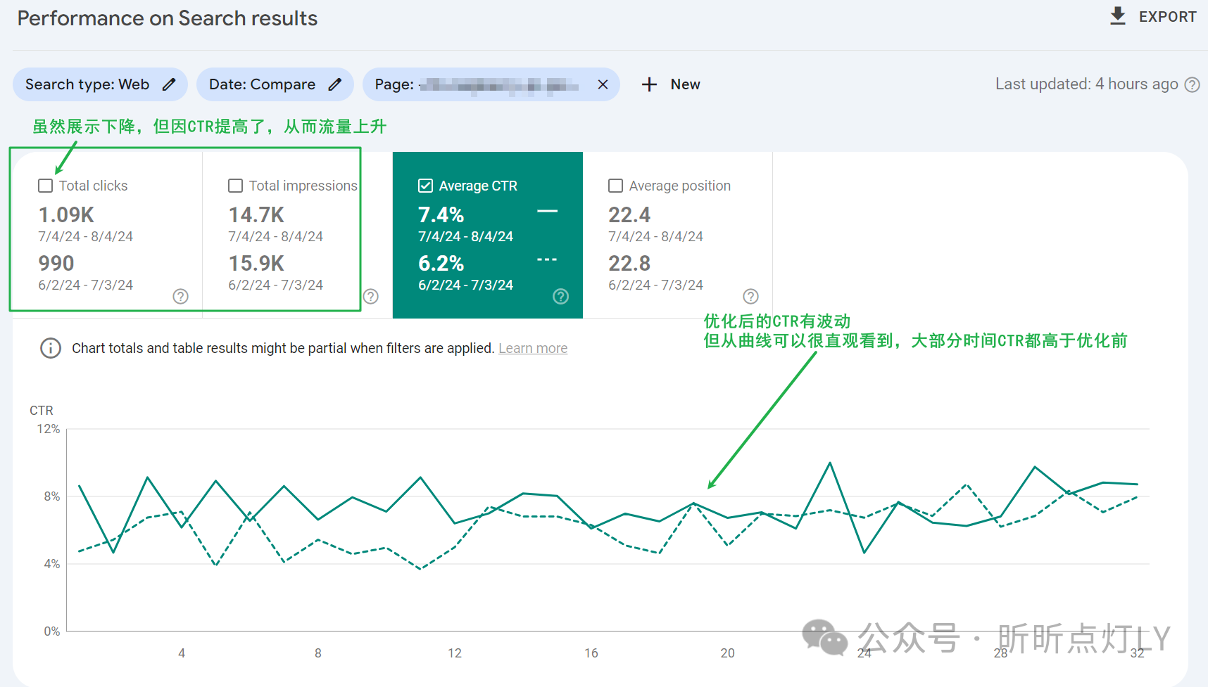 我原本预计CTR会提升30%以上。虽然没有达到预期,但在排名提高0.4位、用户搜索减少导致展示次数下降的情况下,还能带来9.8%的流量提升,这已经相当不错了。