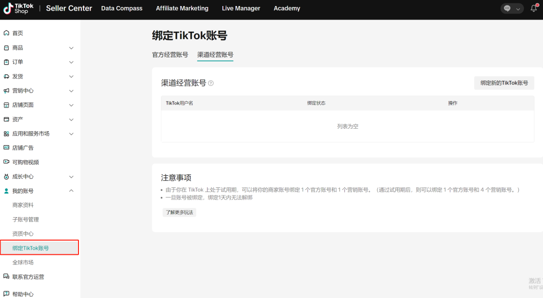 商家可以绑定两种类型的TikTok账号:官方达人和渠道达人。其中商家最多可以绑定一个官方达人,四个渠道达人,但一个达人只能被一个商家绑定,并且在绑定后,1天后才能解绑