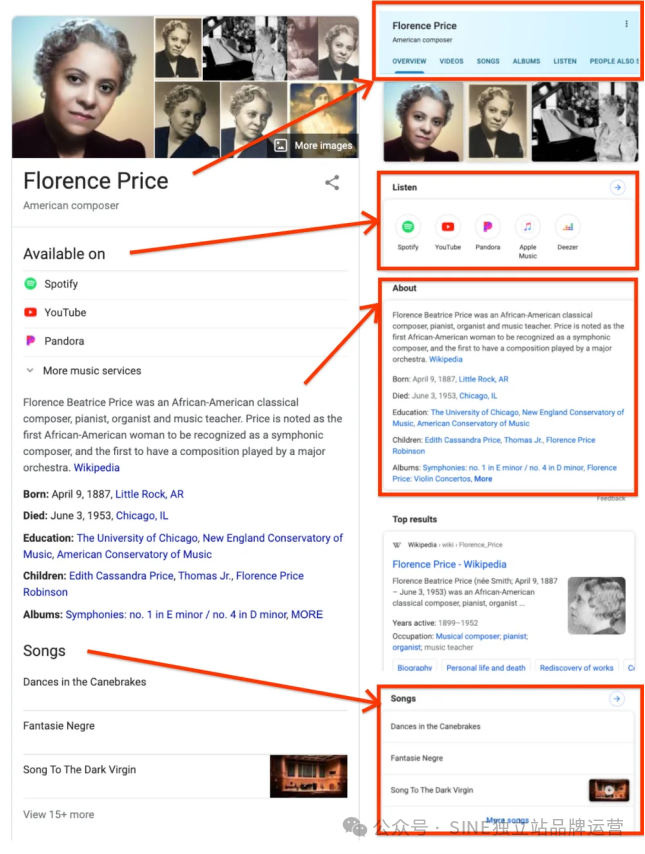 值得一提的是,随着移动端流量日益健壮,谷歌从移动优先索引到不收录无移动端自适应的PC网页。为了更好地适应移动端屏幕,谷歌对搜索结果页面的布局进行了优化。原本在PC端完整的知识面板,在移动端可能会被拆分成多个部分,分散在搜索结果页面的各个位置。如下图所示:
