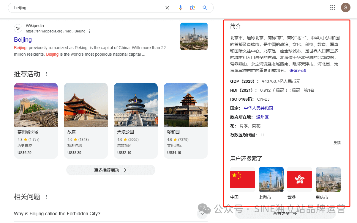 当你在Google搜索某个实体,比如人名、地名等时,它会显示在搜索SERP的右侧,实体面板就像是一张名片。如下图,